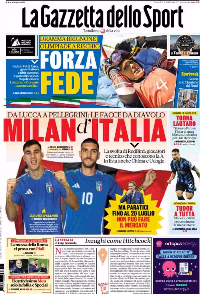 Nella rosea spazio alla Roma antagonista della Juventus domenica in Serie A per una sfida dal sapore di Champions. Per i capitolini, si ragionerebbe per il dopo Claudio Ranieri: l’ultima suggestione conduce a Stefano Pioli. Invece, la prima pagina è dedicata al Milan e alle mosse per la prossima stagione. L’idea sarebbe ricreare una base di calciatori italiani, su tutti puntando su Lucca e Pellegrini, ma anche su Udogie e l’ex bianconero Chiesa.