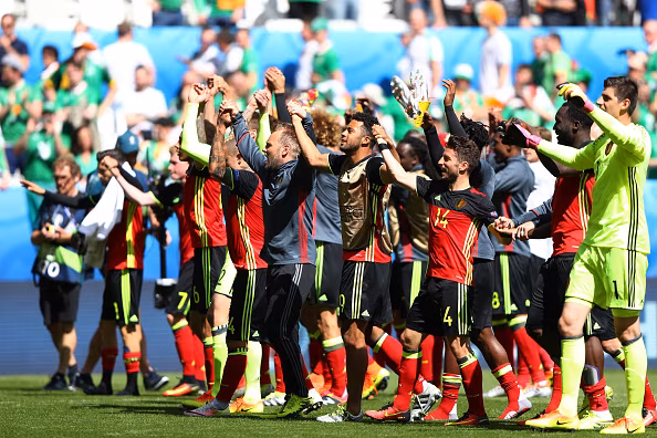 BORDEAUX, FRANCE - JUNE 18: The Belgium team celebrate with supporters following victory in the UEFA EURO 2016 Group E match between Belgium and Republic of Ireland at Stade Matmut Atlantique on June 18, 2016 in Bordeaux, France. (Photo by Ian Walton/Getty Images)